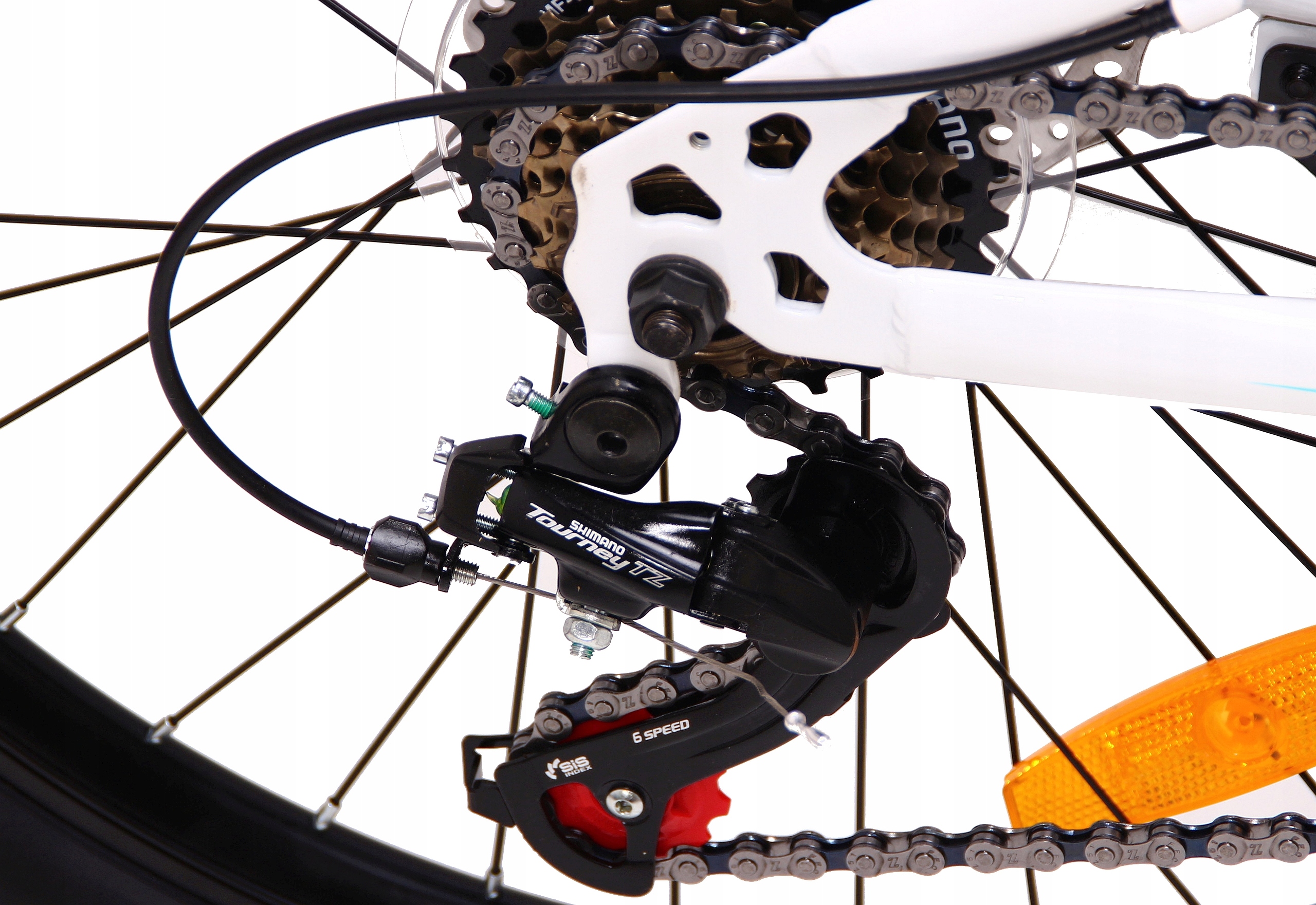 Tylna przerzutka Shimano tourney 7 - speed - pozwala na uzyskanie 21 biegów.